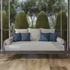 6″ twin mattress-sized seat cushion, 2 bolster pillows, 3 24×24″ pillows and 1″ diameter rope to hang swing.