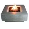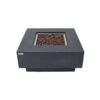 The Elementi Manhattan fire table features a glass-fiber reinforced concrete textured finish in dark gray. The table is easy to set up with a pre-attached 10-ft hose with a regulator for connection to a propane tank.