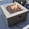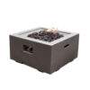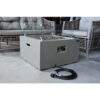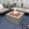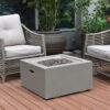 The Modeno Ridgefield fire table features a glass-fiber reinforced concrete smooth finish in light gray. The table is easy to set up with a pre-attached 10-ft hose with a regulator for connection to a propane tank.