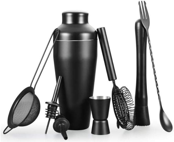 Includes: cocktail shaker (500ml), double jigger (15ml + 30ml), strainer, muddler, sieve, cocktail spoon/fork and 2 pourers