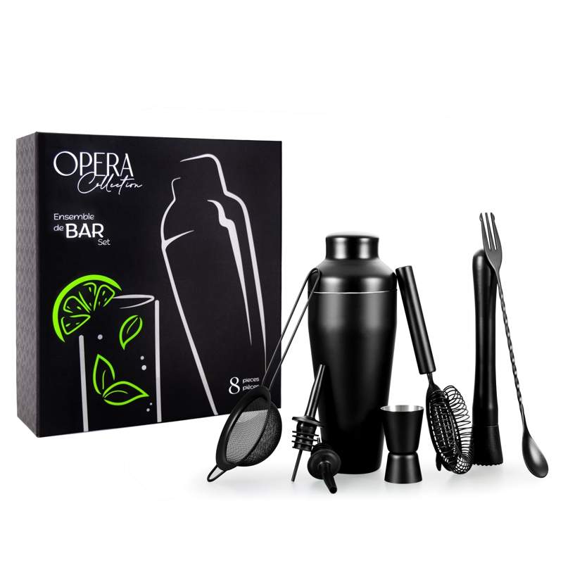 The Opera bartender set includes everything you need for the home bar.Each piece is made of stainless steel with a stylish matte black finish. The set comes beautifully packaged in a gift box ready for gift giving.