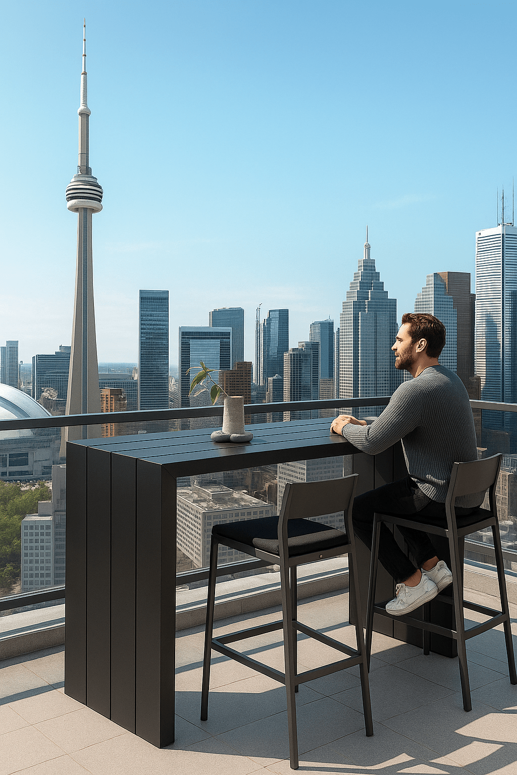 Riverside Bar Table: Crafted from premium-grade aluminum, the Riverside Collection from 2026 blends strength, modern design, and lasting durability. Each frame is finished with a weather resistant powder coat, ensuring resilience against the elements while maintaining a sleek, contemporary aesthetic. The clean lines and robust construction make Riverside a versatile choice for a wide range of outdoor settings. Its modular design allows for flexible configurations, whether styled as a sectional, corner piece, or stand-alone seating, making it an adaptable centerpiece for any patio or terrace. With its timeless silhouette and enduring build, the Riverside Collection delivers both sophistication and practicality, creating an inviting space for outdoor living that lasts season after season.