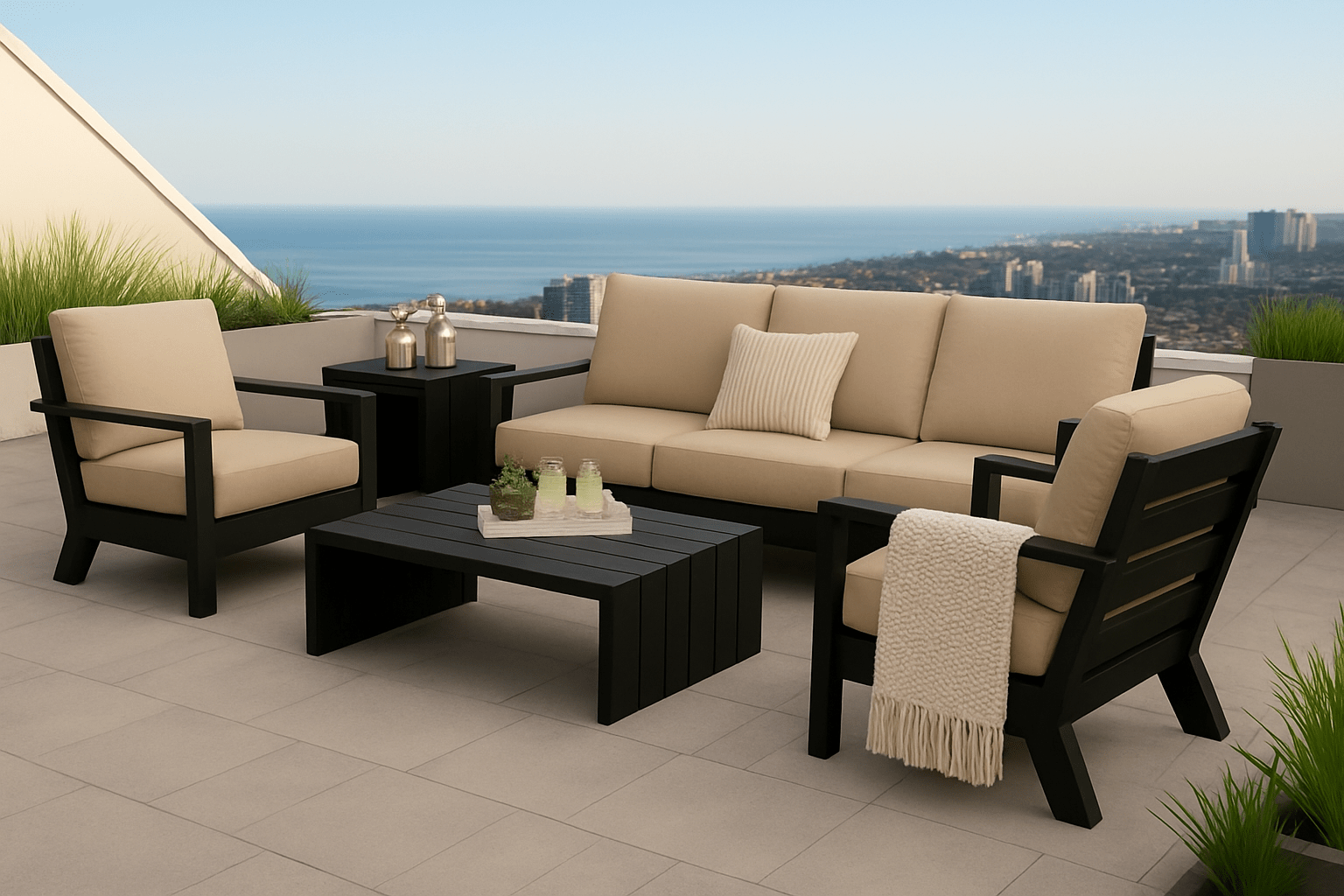 Riverside Club Chair– Crafted from premium-grade aluminum, the Riverside Collection from 2026 blends strength, modern design, and lasting durability. Each frame is finished with a weather resistant powder coat, ensuring resilience against the elements while maintaining a sleek, contemporary aesthetic. The clean lines and robust construction make Riverside a versatile choice for a wide range of outdoor settings. Its modular design allows for flexible configurations, whether styled as a sectional, corner piece, or stand-alone seating, making it an adaptable centerpiece for any patio or terrace. With its timeless silhouette and enduring build, the Riverside Collection delivers both sophistication and practicality, creating an inviting space for outdoor living that lasts season after season. Riverside features in Textured